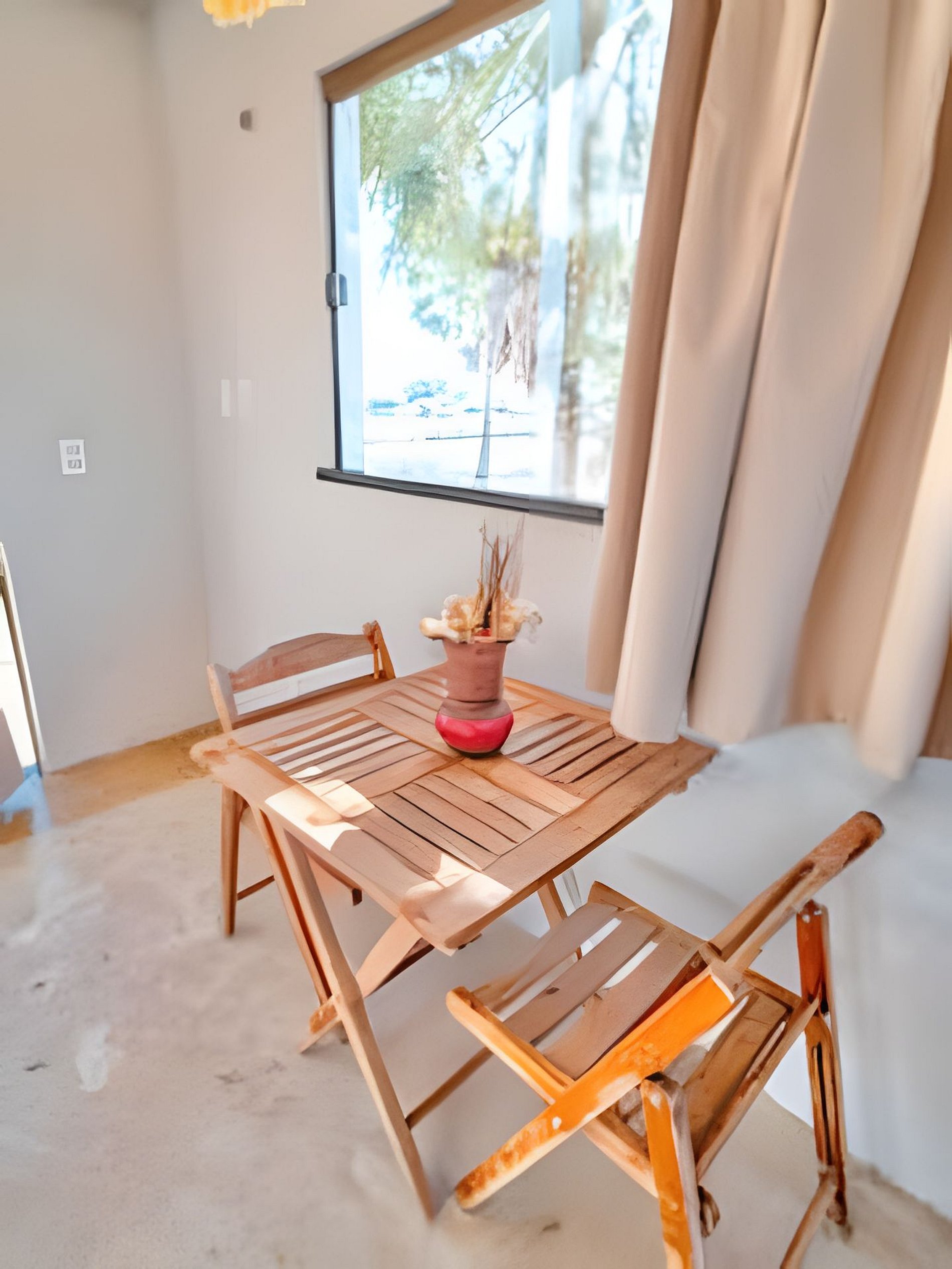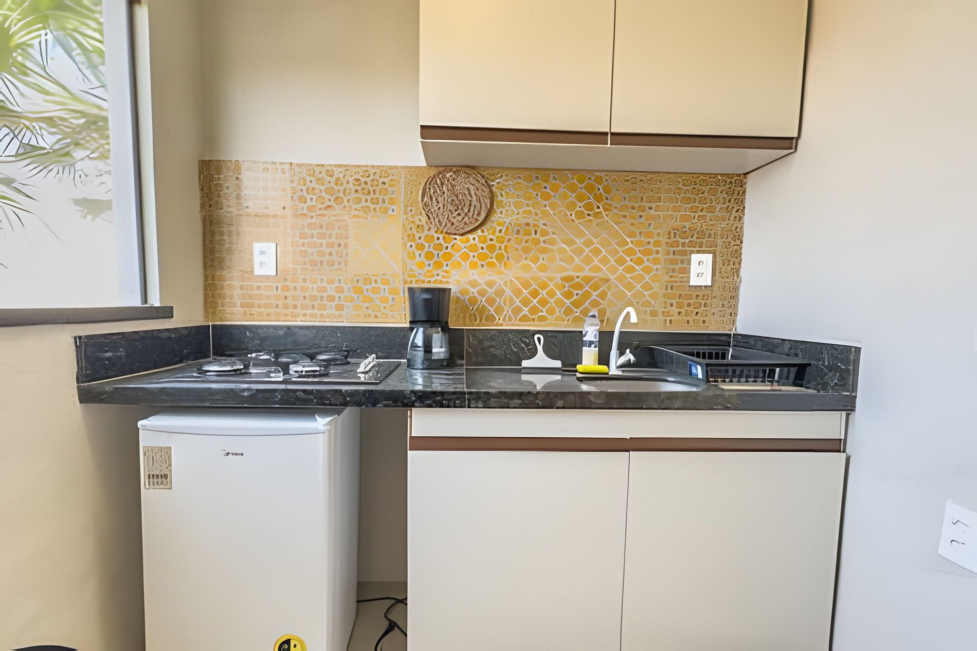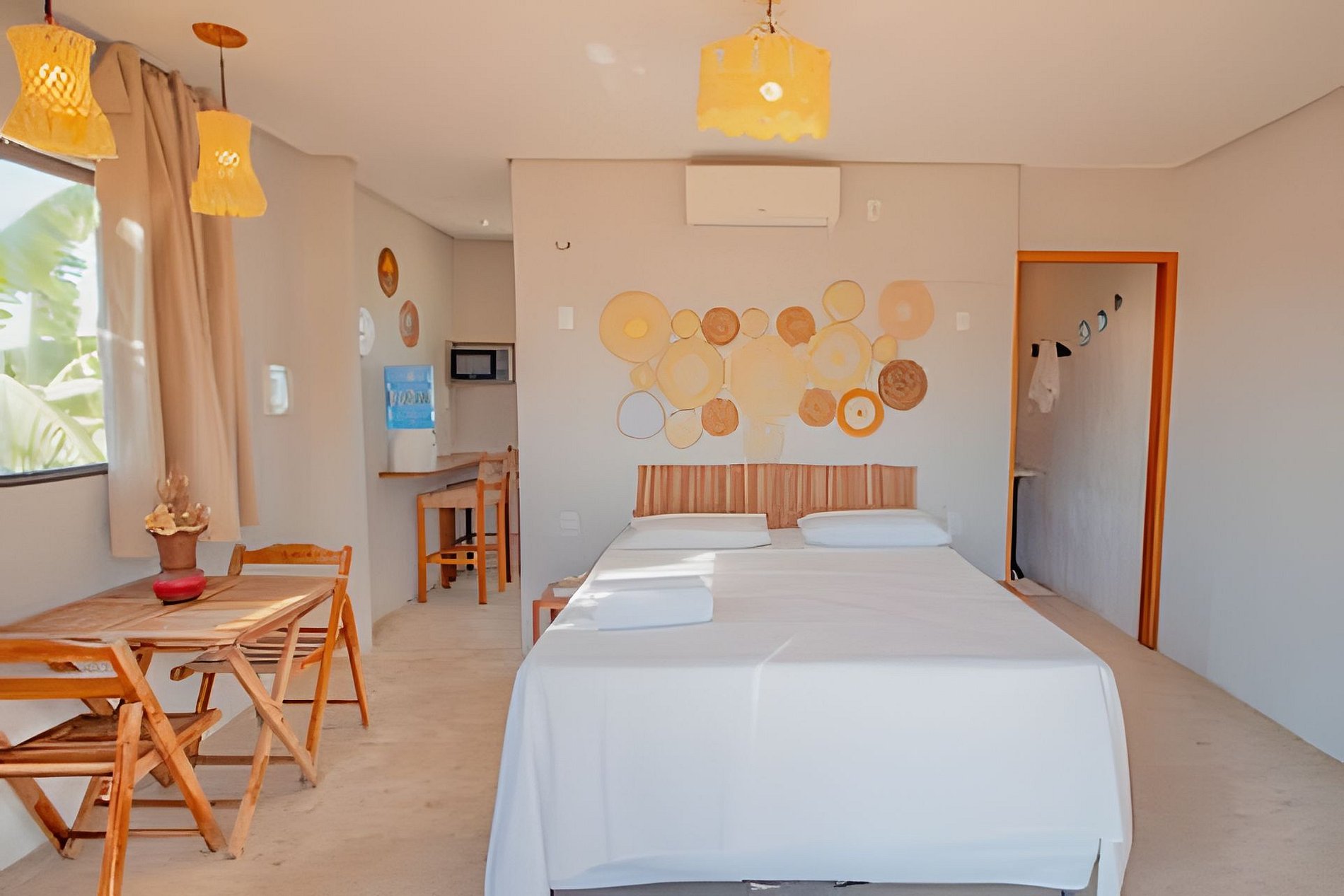 Situado no condomínio Amanita Kite Home, o studio conta com uma decoração praiana, com reboco rústico e tem:
